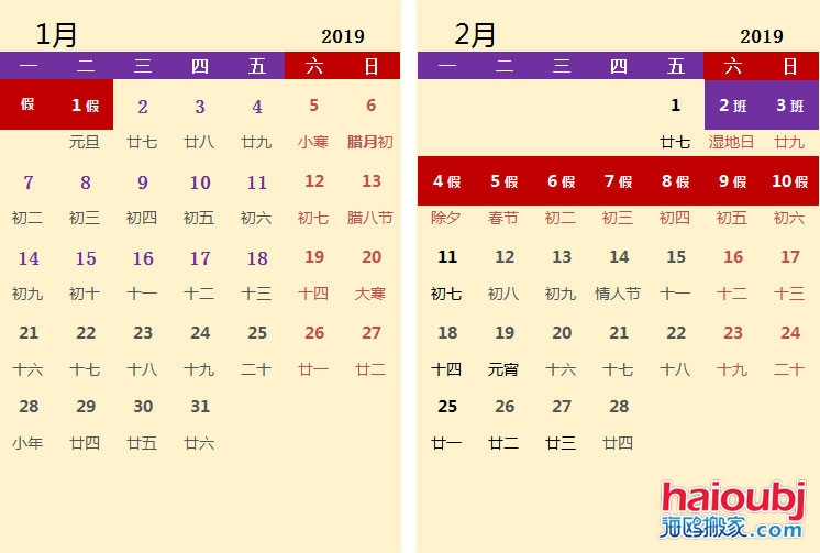 放假時間為2019年2月4日開始到2019年2月10日,共計7天,反正每年都是這樣安排的。2月2日和2月3日分別為周六和周日,均需要正常上班。
